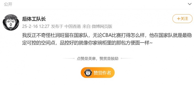 媒體人@后體工隊長發(fā)微博對此發(fā)表看法,他寫道:“我反正不奇怪杜潤旺留在國家隊,無論CBA比賽打得怎么樣,他在國家隊就是最穩(wěn)定可控的空間點,品控好的就像你家碗柜里的那包方便面一樣~??”