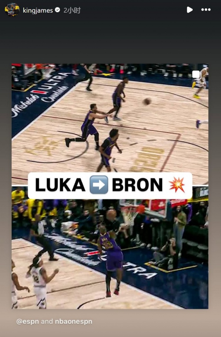 賽后,詹姆斯在INS轉(zhuǎn)發(fā)了東契奇本場數(shù)據(jù),還有他們兩人的一次超遠(yuǎn)距離連線。