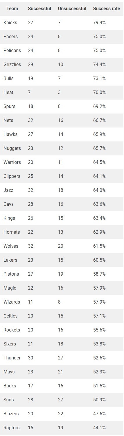 自2019年NBA引入挑戰(zhàn)規(guī)則以來(lái),教練們?cè)谌绾斡行褂锰魬?zhàn)方面經(jīng)歷了一段摸索期。在規(guī)則實(shí)施的第一年,教練挑戰(zhàn)的整體成功率僅為44%。如今成功率已經(jīng)顯著上升,截至2月23日,NBA教練挑戰(zhàn)的成功率已達(dá)到61%。教練們?cè)谌绾问褂锰魬?zhàn)方面變得更加聰明,無(wú)論是在選擇挑戰(zhàn)的回合類型上,還是在快速查看回放以做出更好決策方面。盡管如此,聯(lián)盟中各位教練的挑戰(zhàn)成功率和使用頻率仍存在較大差異。不過(guò),挑戰(zhàn)的決定遠(yuǎn)比球迷在電視機(jī)前看到的要復(fù)雜得多。