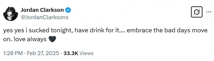 賽后,克拉克森更推道:“是的,是的,我今晚表現(xiàn)太爛了,為此我已經(jīng)喝了點。要擁抱糟糕的歲月,繼續(xù)前進。愛是永恒的?????!?/p>