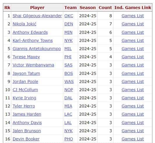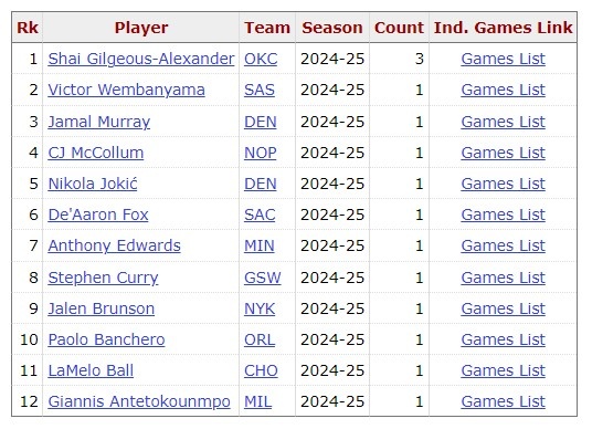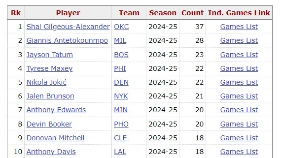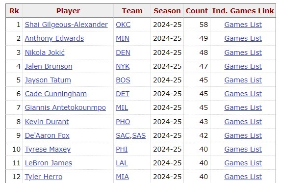 根據(jù)數(shù)據(jù)統(tǒng)計(jì),賽季至今,亞歷山大20+、30+、40+、50+場(chǎng)次以及場(chǎng)均得分(32.6分)都是聯(lián)盟第一。