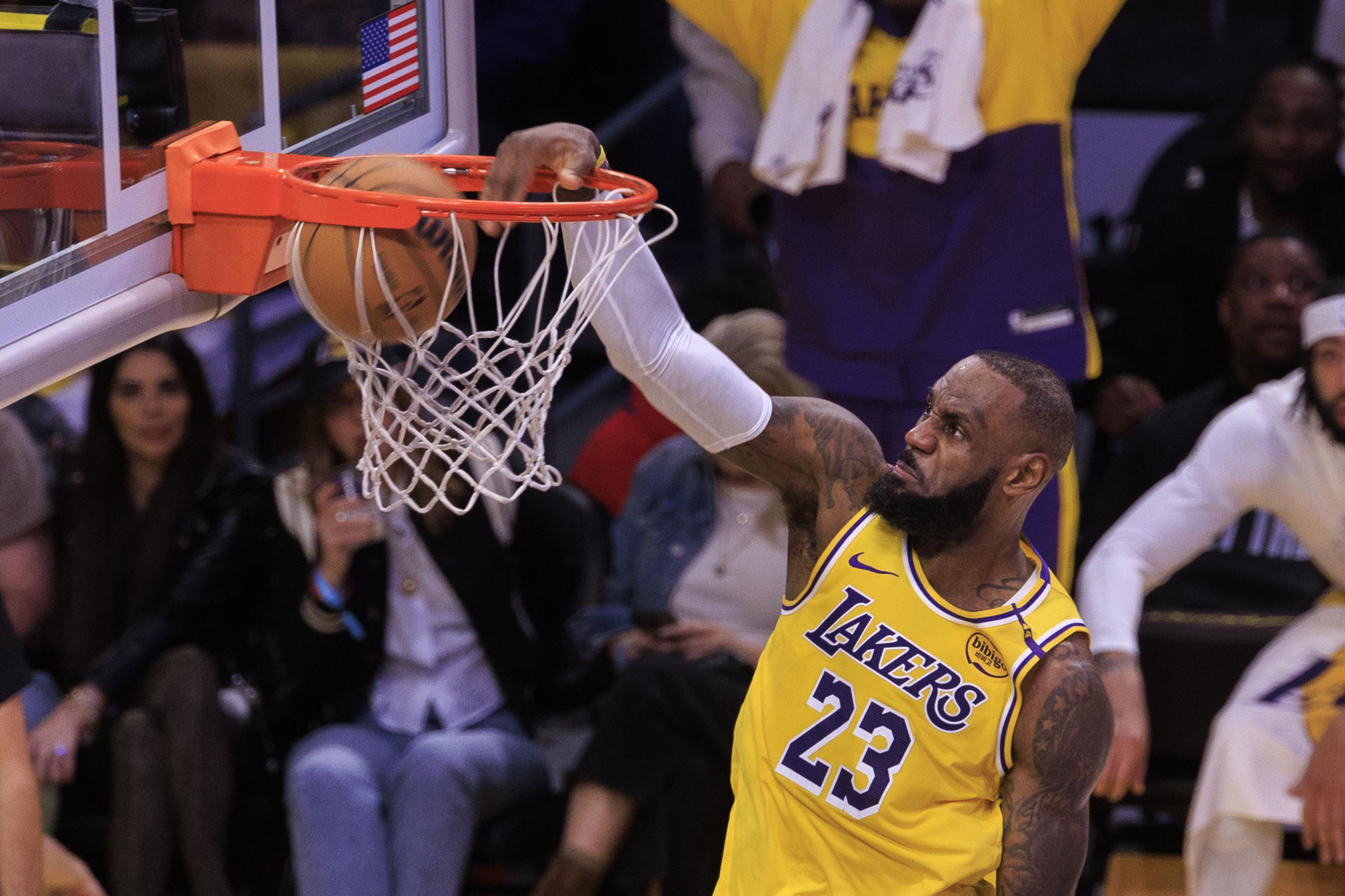 由于阿努諾比傷退,哈特下半場(chǎng)主防老詹,老詹單挑哈特神勇攻堅(jiān)連拿7分,兩記暴扣猶如天神下凡,用最完美的比賽狀態(tài)撐起了湖人的進(jìn)攻端。