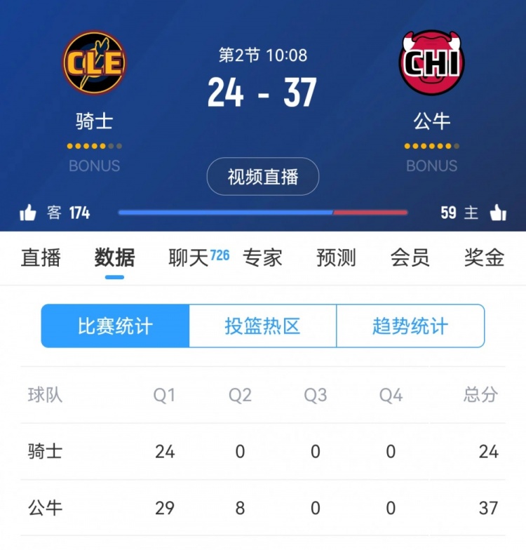 半場戰(zhàn)報:殘陣公牛一度領(lǐng)先騎士15分 米切爾與加蘭合計22中6