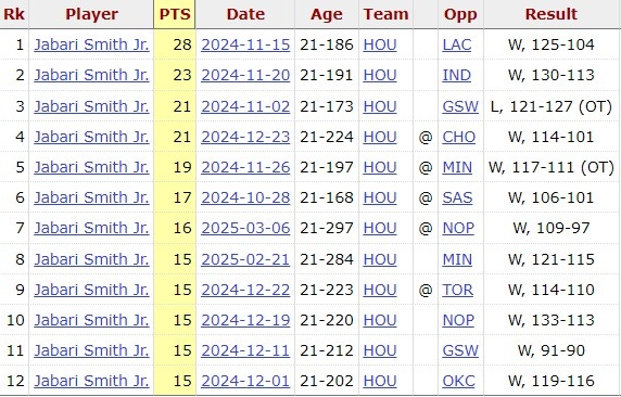 據(jù)統(tǒng)計,賈巴里-史密斯本賽季得分15+的比賽火箭12勝1負(fù),只輸給勇士。