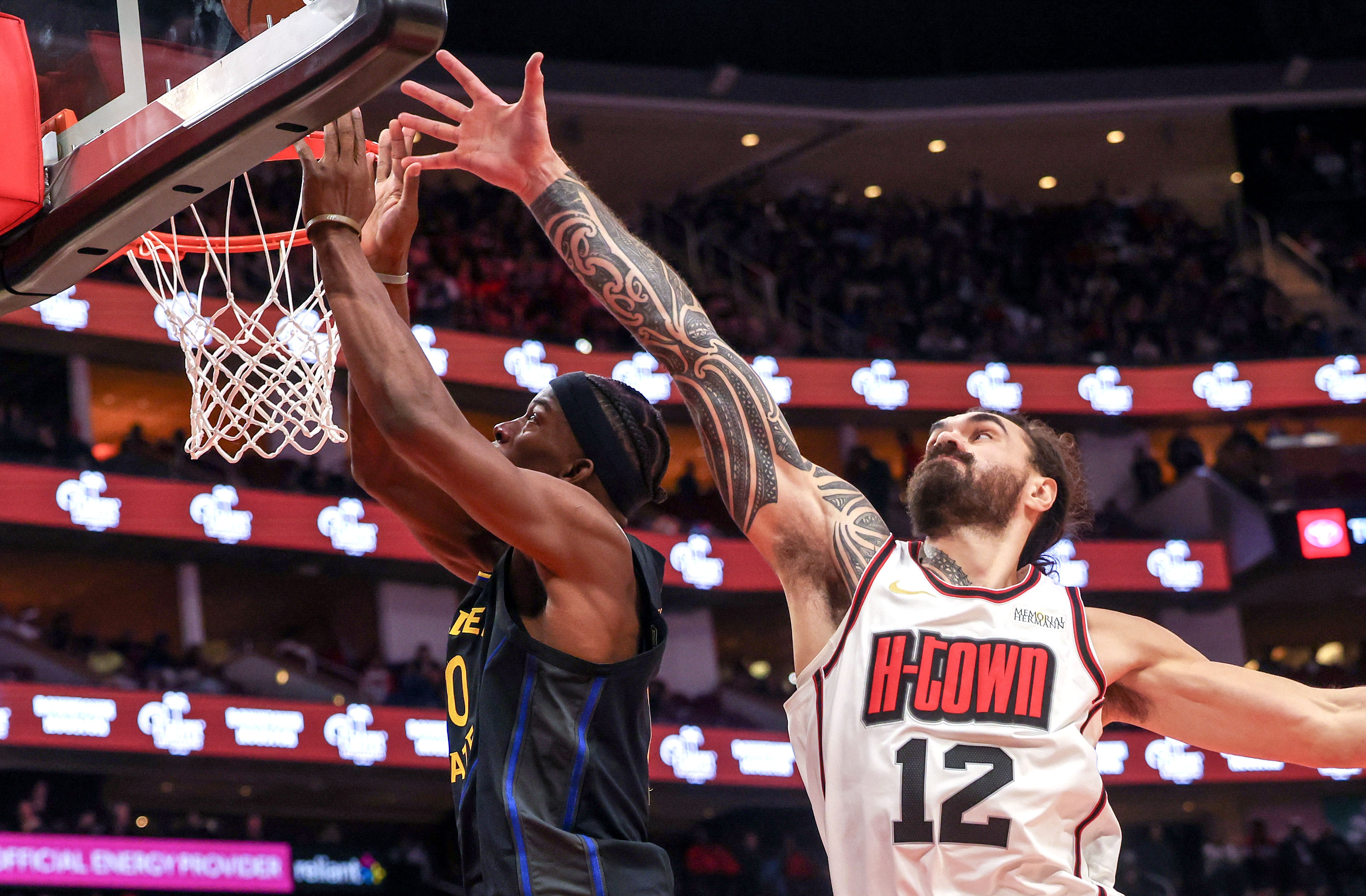 防守端,火箭一直習(xí)慣用人盯人,小賈巴里-史密斯健康時,他與申京守錯位防守,申京對位非空間點,全隊大量使用換防?;鸺褂寐?lián)防并不多,但自從雙塔試驗上線,火箭使用聯(lián)防的頻率明顯提升,亞當(dāng)斯站中路,申京更多掃蕩。