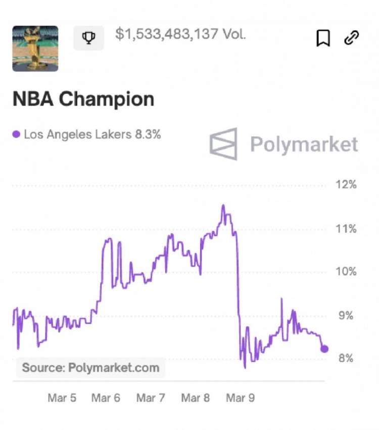 3月11日訊 今日湖人108-111不敵籃網(wǎng)。賽后美媒Polymarket更新了湖人的奪冠概率——8.3%。值得一提的是,在詹姆斯受傷后,湖人奪冠概率由11%+下降了大概3個百分點。 標(biāo)簽: 籃球 NBA 湖人 詹姆斯