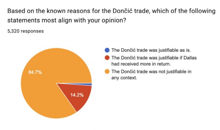 參與問卷調(diào)查的5320名球迷中,84.7%的球迷認(rèn)為東契奇交易在任何情況下都說不過去,14.2%的球迷認(rèn)為如果獨行俠獲得更多的回報,那么東契奇交易說得過去,認(rèn)為東契奇交易說得過去的球迷只占1.1%。