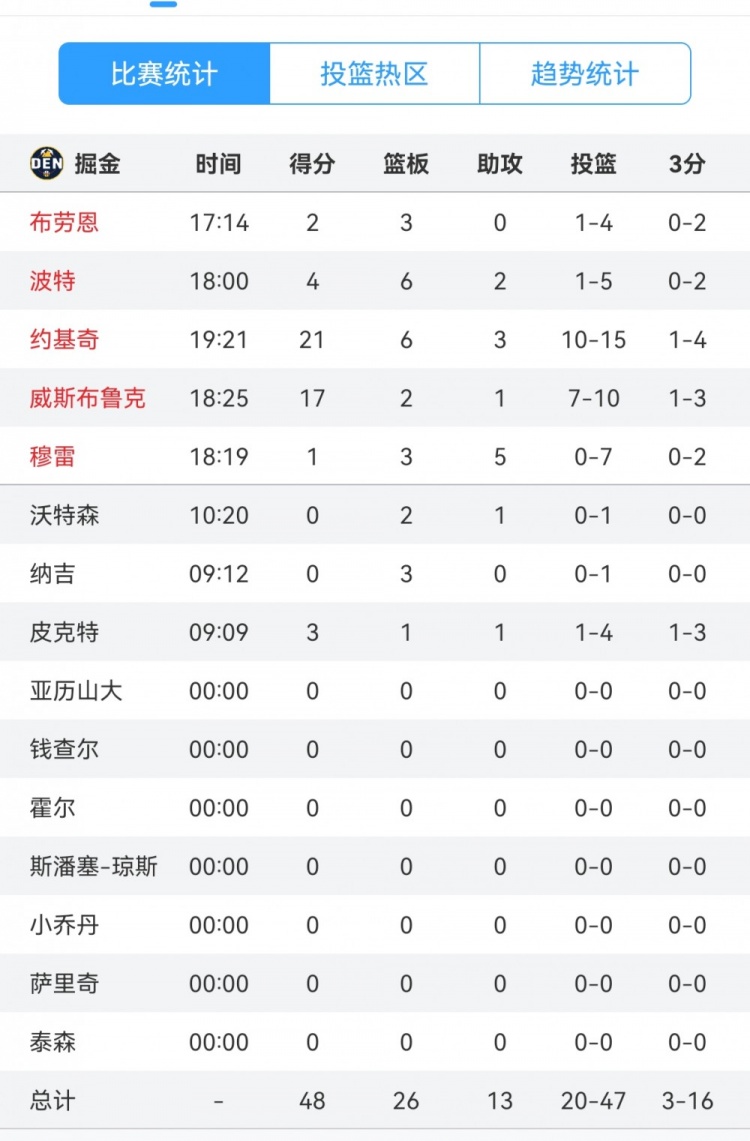 上半場,掘金除約基奇和威少外均表現(xiàn)不佳,全隊(duì)半場47投20中,約基奇和威少25投17中,其他人合計(jì)22投僅3中,其中賈馬爾-穆雷個人7投0中。