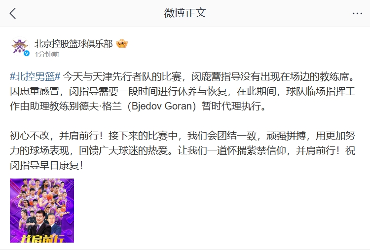 03月15日訊 北控男籃官宣:因患重感冒,閔指導(dǎo)需要一段時間進(jìn)行休養(yǎng)與恢復(fù),在此期間,球隊臨場指揮工作由助理教練別德夫·格蘭(Bjedov Goran)暫時代理執(zhí)行。