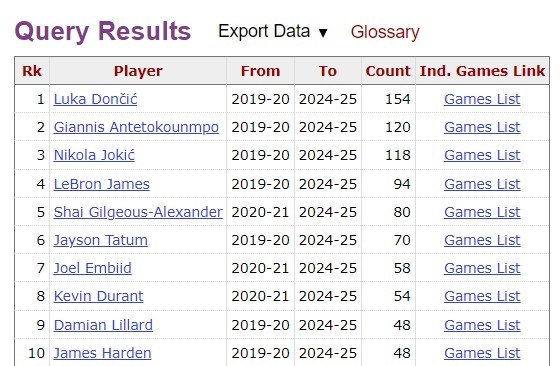 2020年以來的30+5+5場次榜單:東契奇155場居首 字母哥120場第2