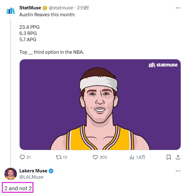 湖人媒體Lakers Muse評(píng)論道:“前二,但不是第二。”