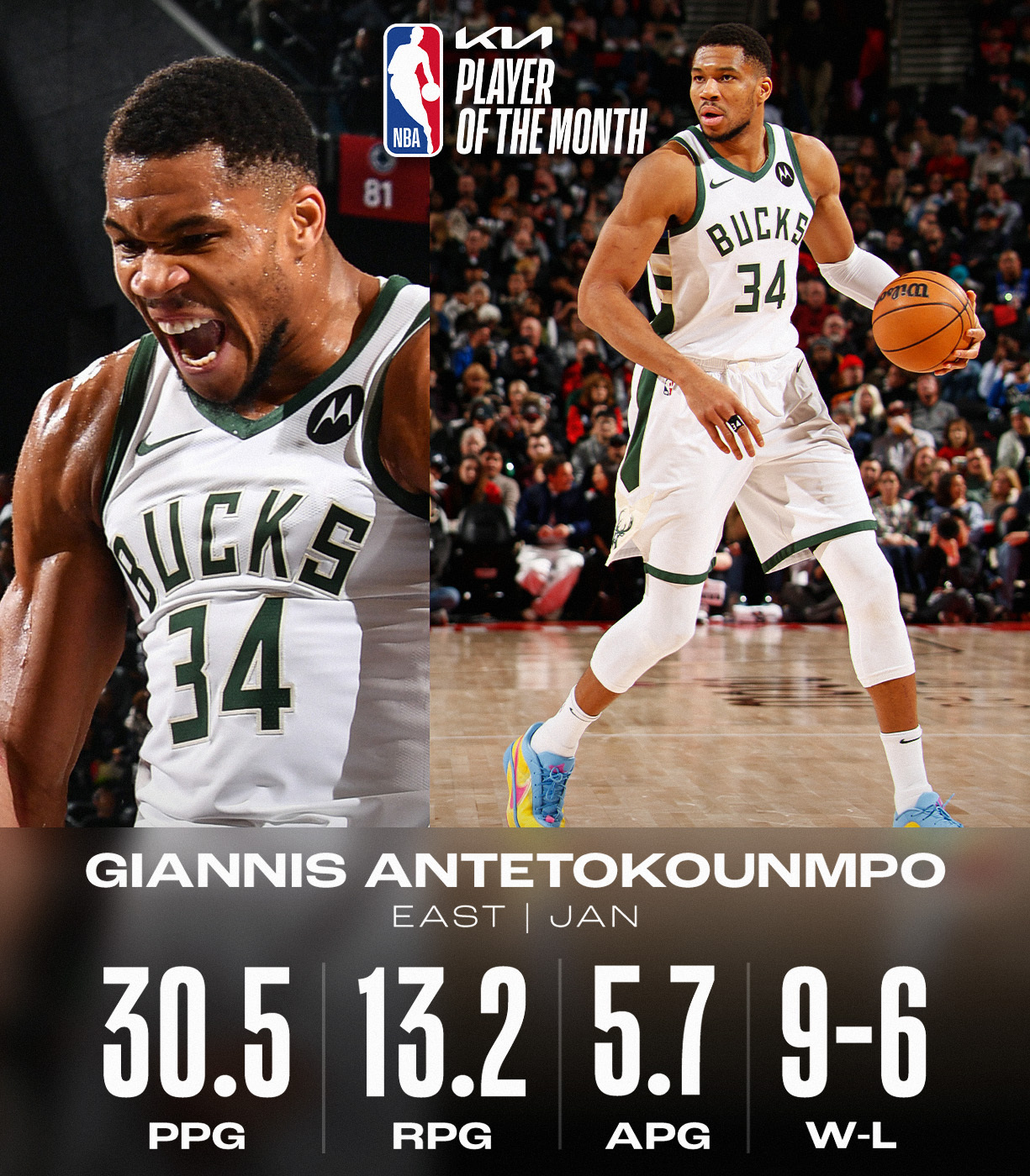 字母哥一月場(chǎng)均:30.5分13.2籃板5.7助攻,出戰(zhàn)的比賽雄鹿9勝6負(fù);