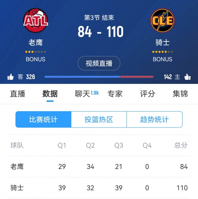 1月31日訊 NBA常規(guī)賽,騎士三節(jié)110-84領(lǐng)先老鷹。