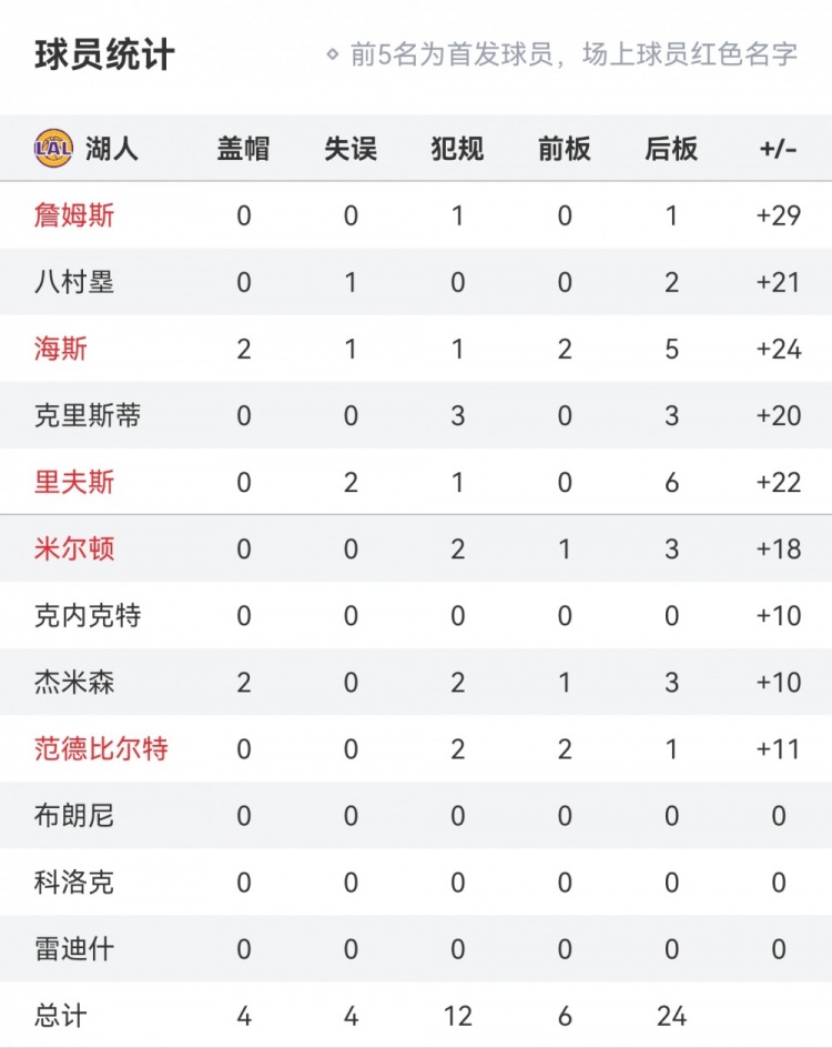 1月31日訊 NBA常規(guī)賽,湖人半場(chǎng)78-45領(lǐng)先奇才。半場(chǎng)比賽,湖人每名出場(chǎng)球員正負(fù)值都很高,均達(dá)到了兩位數(shù)。 標(biāo)簽: 籃球 NBA 湖人