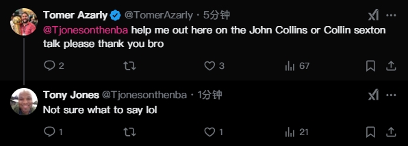 02月06日訊 快船記者Tomer Azarly發(fā)推向爵士記者Tony Jones求助:“哥們,快幫我問問科林斯和塞克斯頓的情況咋樣?謝謝你了好兄弟!”