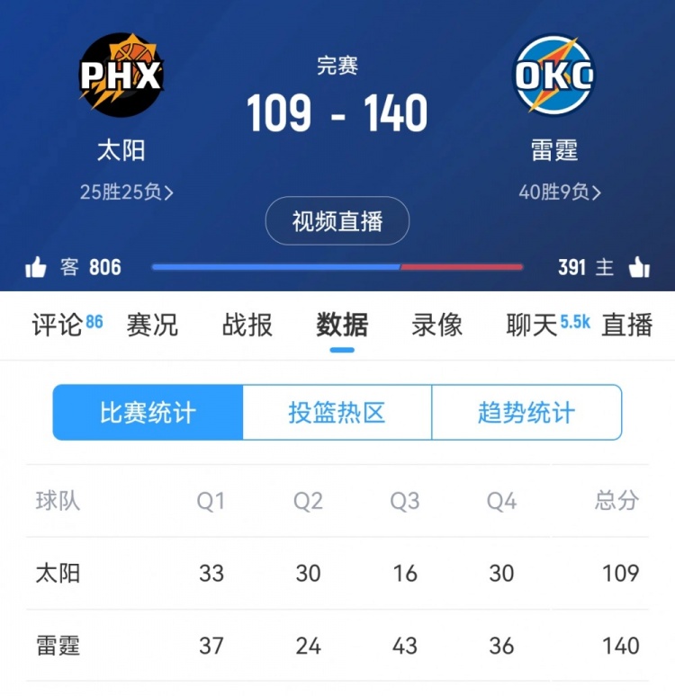 上半場(chǎng),太陽還以63-61領(lǐng)先雷霆,但下半場(chǎng)命中率驟降,全隊(duì)拿到46分,尤其第三節(jié)16-43凈負(fù)27分,最終31分慘敗對(duì)手。
