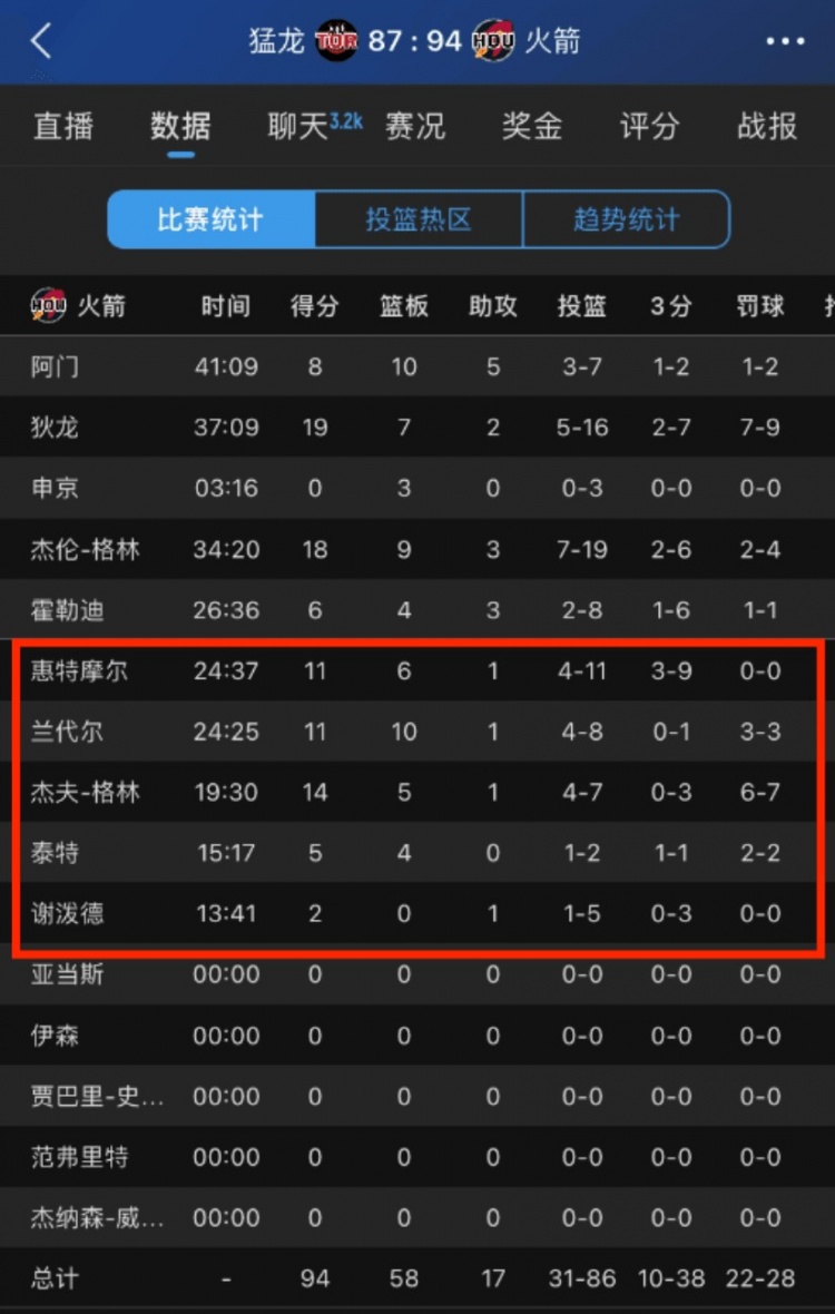 其中,杰夫-格林7中4(三分3中0),罰球7中6砍下賽季新高14分(此前最高10分),末節(jié)更是拿到8分帶隊(duì)反超;白魔和蘭代爾都是11分,泰特5分,謝潑德2分。