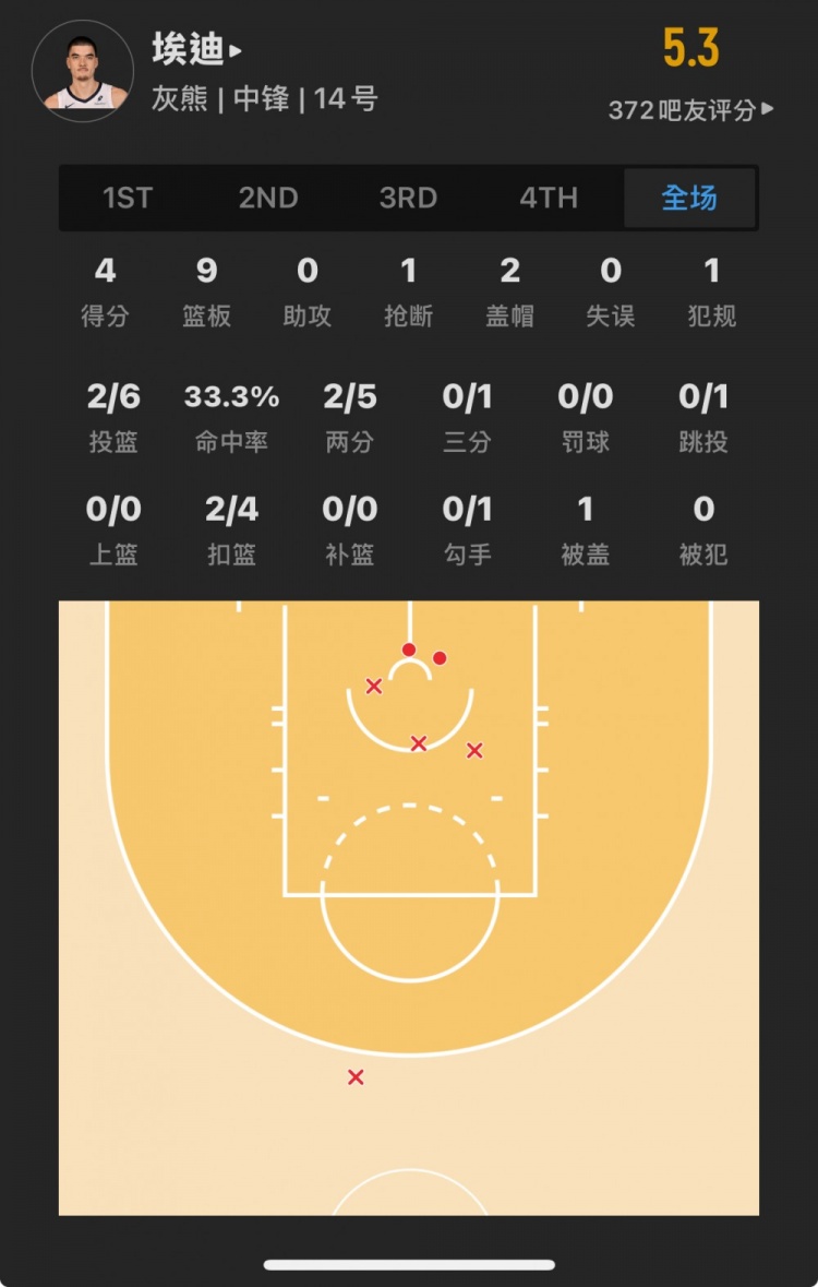 灰熊9號秀 扎克-埃迪 登場19.7分鐘