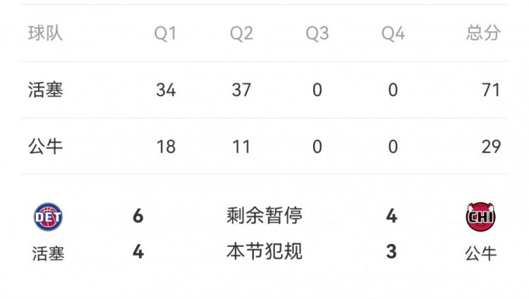 2月12日訊 NBA常規(guī)賽,活塞半場71-29領(lǐng)先公牛。
