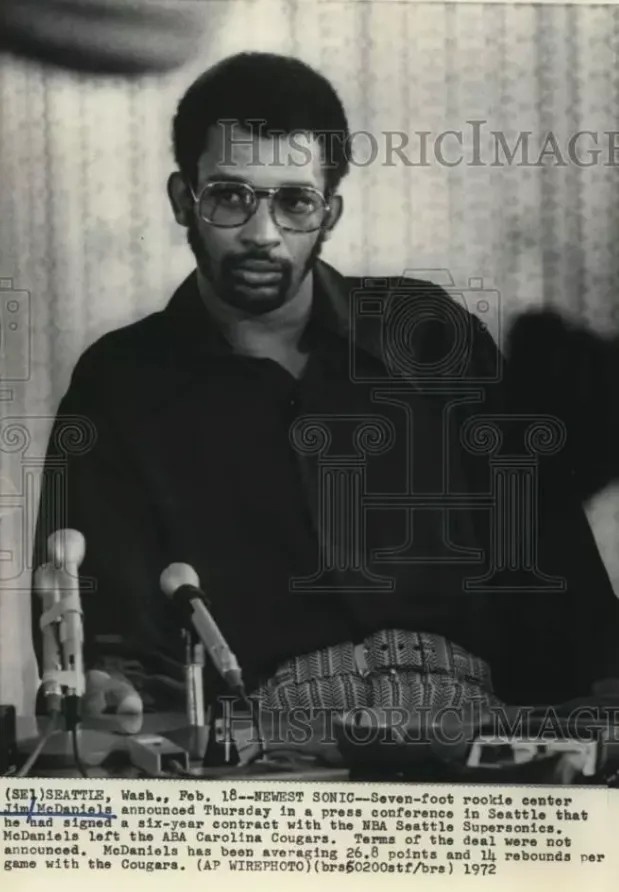 麥克丹尼爾斯在大學(xué)進(jìn)了NCAA全美一陣,隨后在ABA打了一年場均26.8分14籃板,算是全美聞名的超級新人內(nèi)線