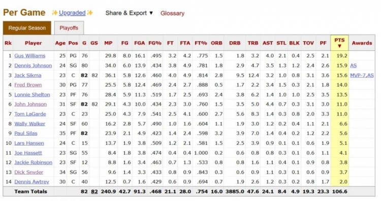 1975-76賽季,超音速成為了全聯(lián)盟最年輕的球隊(duì)。他們的核心是23歲的湯姆-伯利森、24歲的“光頭”沃茨、24歲的萊昂納德-格雷與27歲的弗雷德-布朗。他們斗志昂揚(yáng),球風(fēng)強(qiáng)硬,出人意料地取得了43勝39負(fù)的常規(guī)賽戰(zhàn)績,再次重返季后賽。