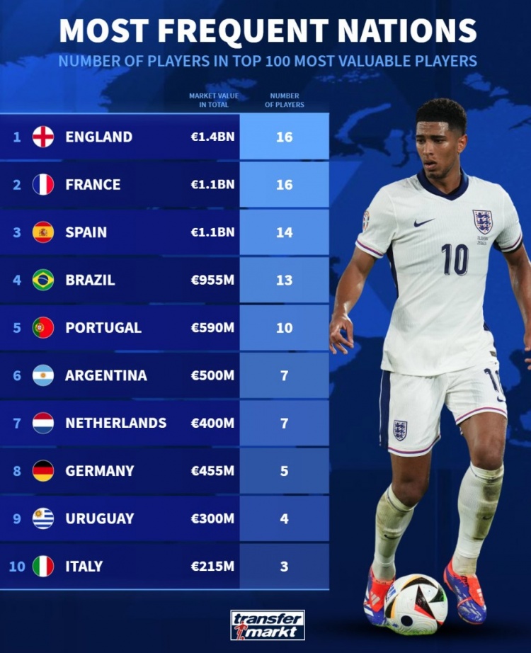德轉(zhuǎn)列身價(jià)前100球員國(guó)籍:英法各16人,西、巴、葡列前五