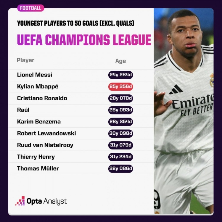 首回合對皇馬哈蘭德打進兩球,將個人歐冠進球數(shù)提升至49球,如果次回合哈蘭德再度攻破皇馬球門,那他將以24歲213天的年齡,成為最快達成歐冠50球的球員。