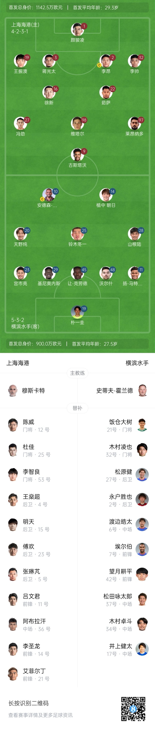 海港vs橫濱水手首發(fā):4外援PK5外援,蔣光太復出,張琳芃替補
