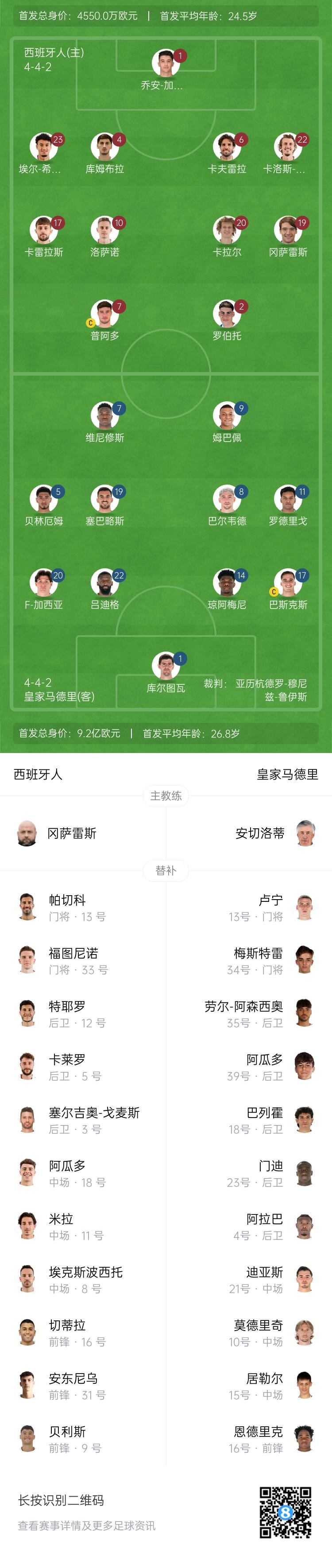 皇馬首發(fā):1-庫爾圖瓦、17-巴斯克斯、14-瓊阿梅尼、22-呂迪格、20-弗蘭-加西亞、8-巴爾韋德、19-塞巴略斯、5-貝林厄姆、11-羅德里戈、7-維尼修斯、9-姆巴佩