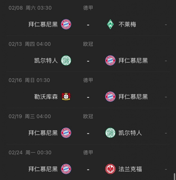 拜仁2月賽程↓