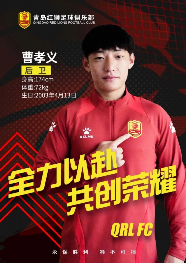 曹孝義,出生于2003年4月13日,身高174cm,體重72kg,場上司職邊后衛(wèi)。2018年入選湖北足協(xié)U15隊,并以隊長身份獲得全國青超聯(lián)賽冠軍;2023賽季簽約無錫吳鉤隊,中甲聯(lián)賽出場14次,1粒進球;足協(xié)杯出場1次,首發(fā)并打滿全場。加入青島紅獅,希望他發(fā)揮所長,在穩(wěn)固后防、邊路往返、組織進攻和后場出球上給予紅獅更多助力!