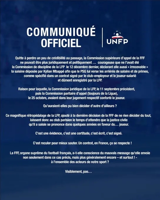 法國(guó)職業(yè)球員工會(huì)發(fā)表官方公告,嚴(yán)厲批評(píng)法國(guó)足協(xié)上訴委員會(huì)延續(xù)法國(guó)職業(yè)聯(lián)盟紀(jì)律委員會(huì)去年的決定,前者對(duì)姆巴佩和巴黎的薪資糾紛案“不予受理”。