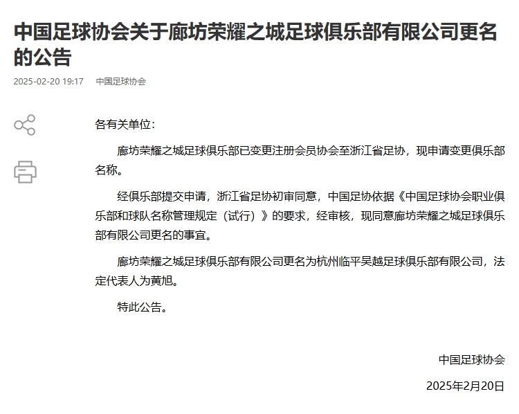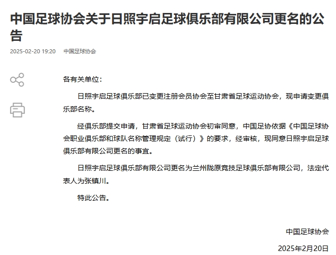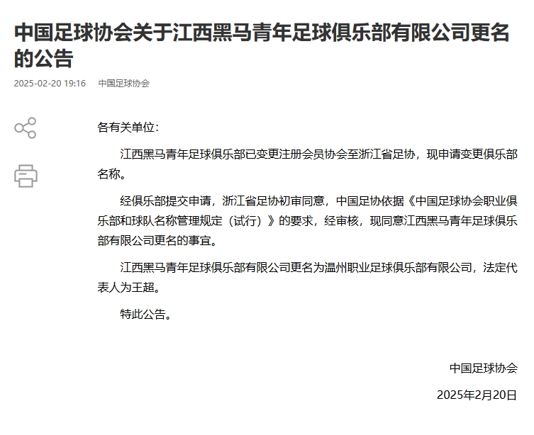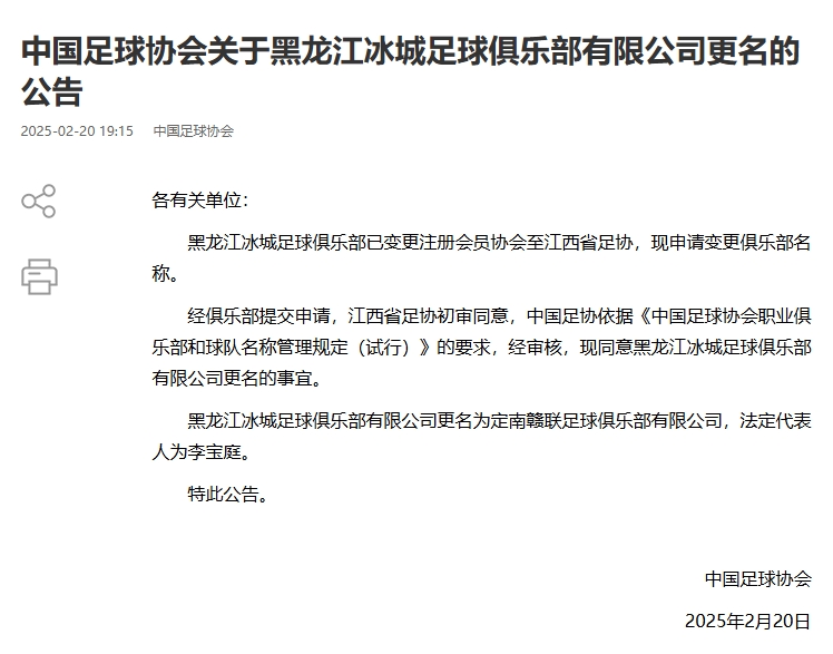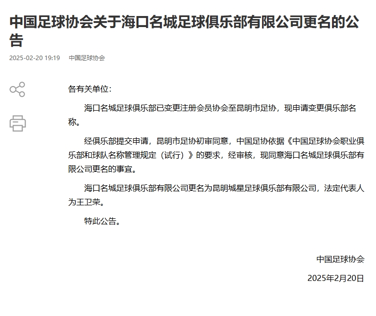 02月20日訊 中國足協(xié)官宣5家職業(yè)足球俱樂部的更名事宜,此前這5家俱樂部已經(jīng)變更注冊會員協(xié)會,也就是俗稱的“異地搬遷”。