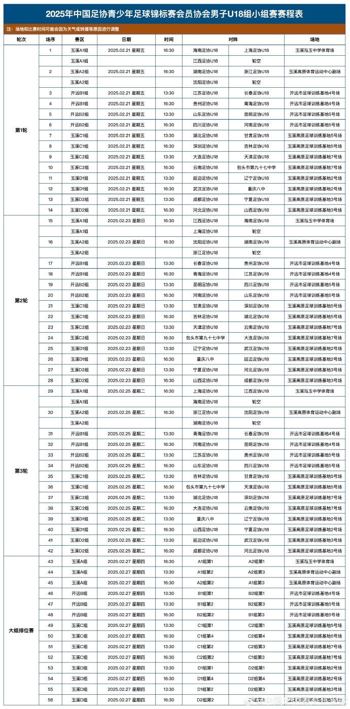 2025年中國足協(xié)青少年足球錦標(biāo)賽會員協(xié)會男子U18組小組賽賽程表 ????? ???