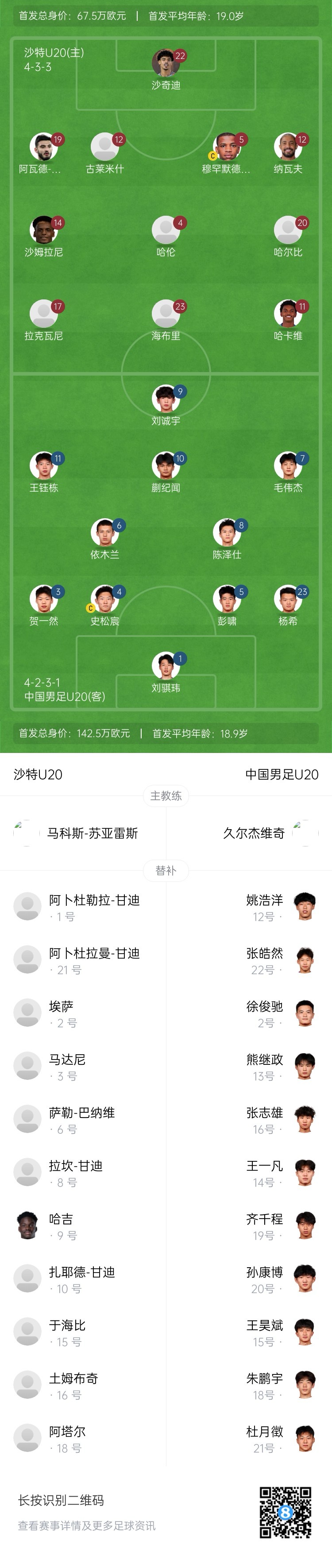 沙特U20替補:1-阿卜杜拉-甘迪、2-蘇丹-伊薩、3-圖爾基-邁達(dá)尼、6-薩利赫-巴爾納維、7-阿里-邁赫達(dá)維、8-拉坎-甘迪、9-塔拉勒-哈吉、10-齊亞德-甘迪、15-阿馬爾-尤海比、16-沙特-通卜蒂、18-拉米茲-阿塔爾、21-阿卜杜勒拉赫曼-甘迪