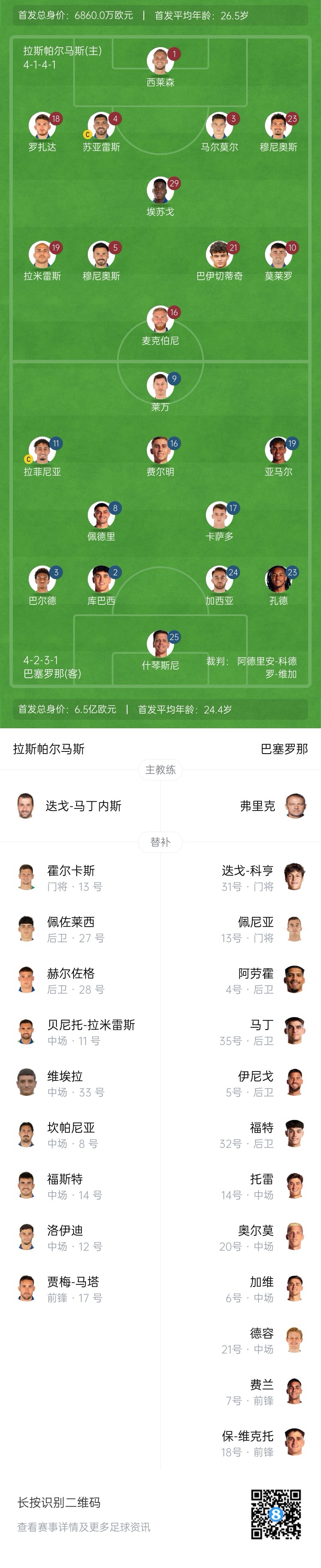 巴薩首發(fā):25-什琴斯尼、2-庫巴西、3-巴爾德、23-孔德、24-埃里克-加西亞、8-佩德里、16-費(fèi)爾明、17-卡薩多、11-拉菲尼亞、19-亞馬爾、9-萊萬