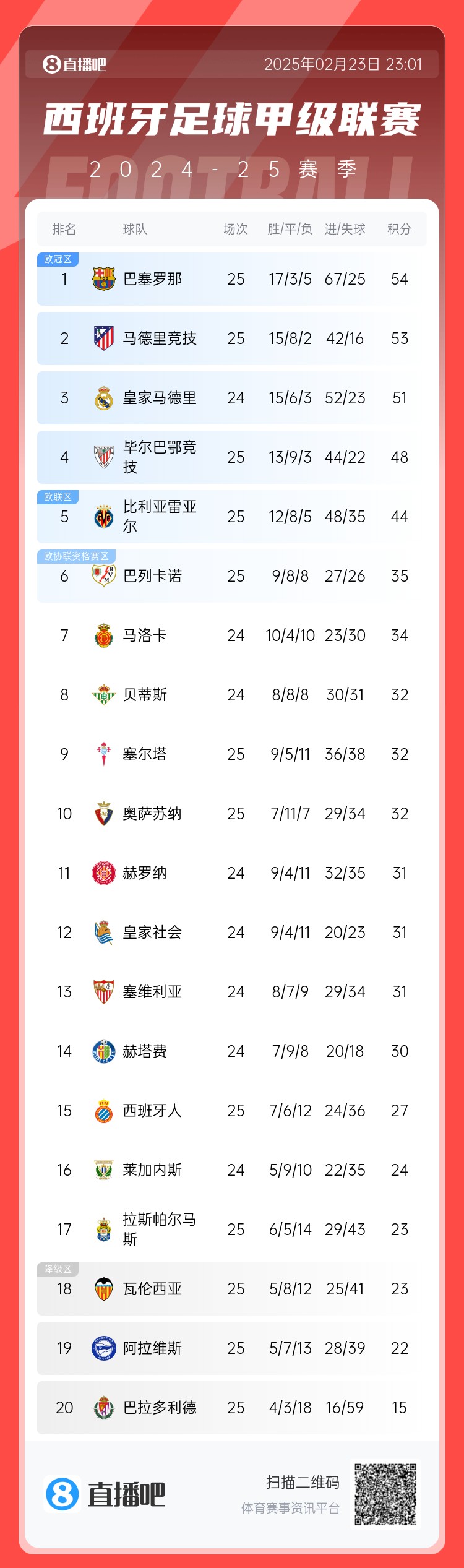02月23日訊 西甲第25輪,畢爾巴鄂競技主場7-1狂勝巴拉多利德,距少賽一場的皇馬僅3分。