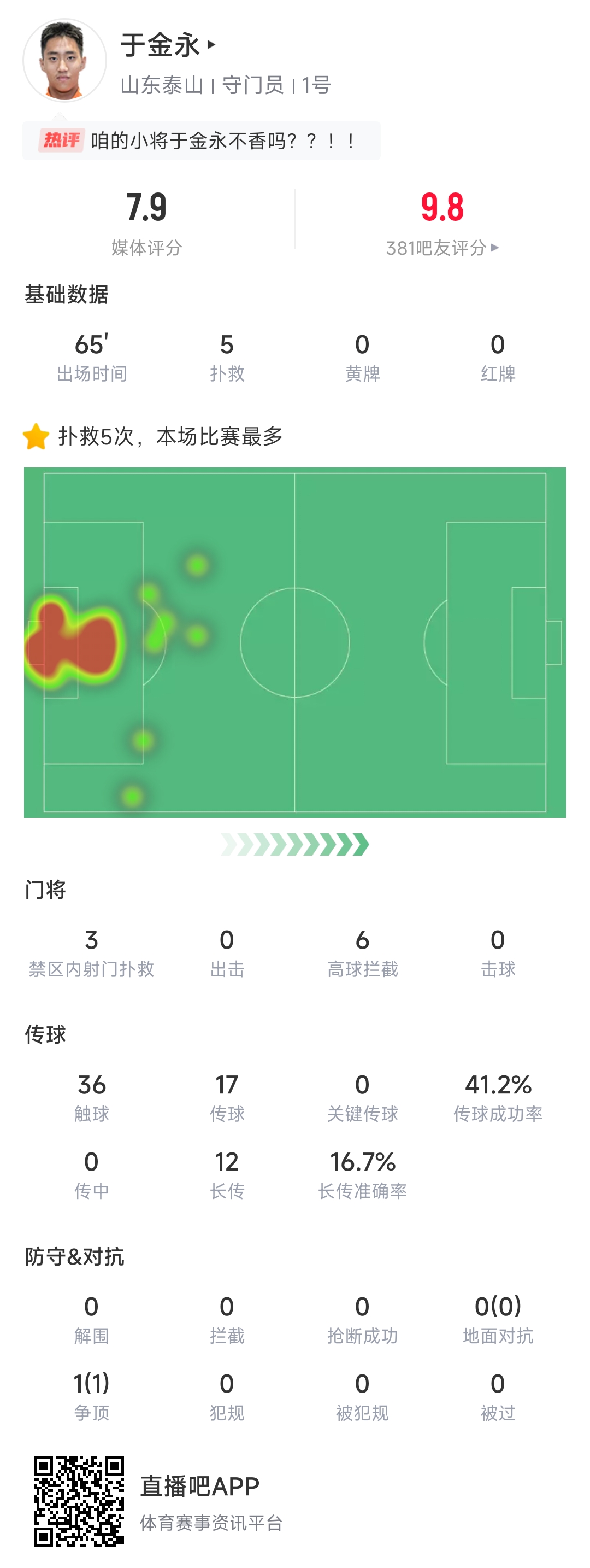 02月23日訊 中超第1輪,山東泰山主場0-0戰(zhàn)平河南隊,在首發(fā)門將王大雷第23分鐘就被紅牌罰下的情況下,20歲的替補門將于金永臨危救主,全場貢獻5次撲救,力保球門不失。