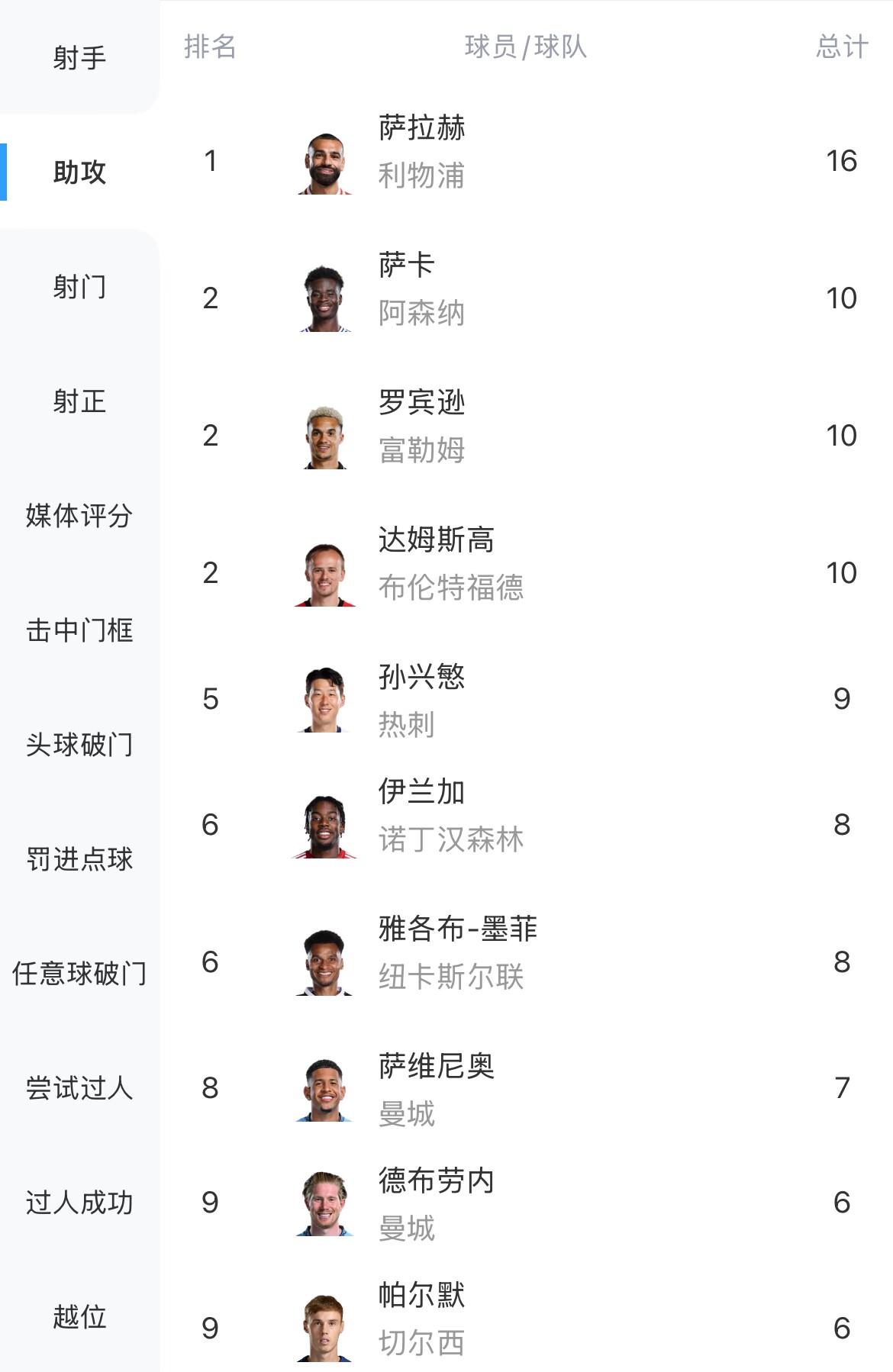 薩拉赫目前以25球領(lǐng)跑射手榜,領(lǐng)先哈蘭德和伊薩克6球。助攻榜上,薩拉赫16助領(lǐng)跑,領(lǐng)先薩卡等人6個。