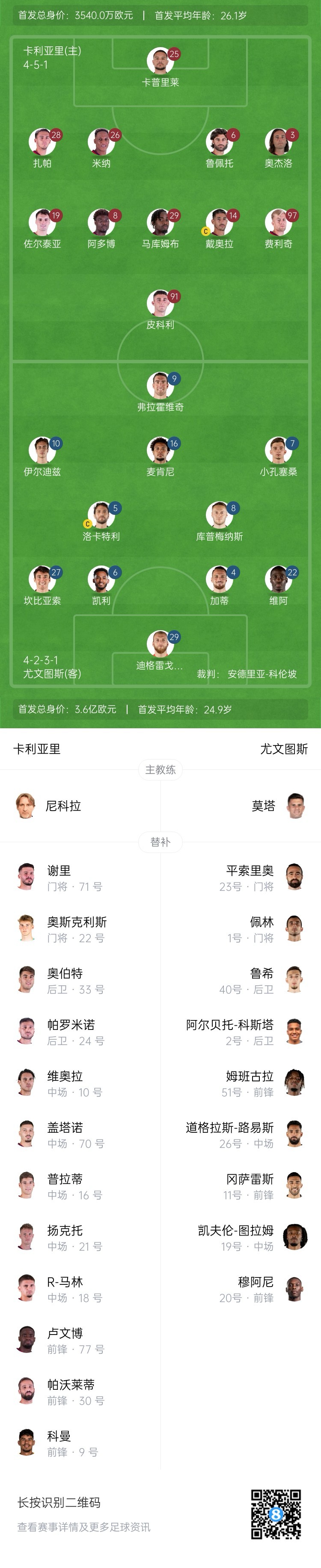 卡利亞里替補:71-謝里、22-奧斯克利斯、33-奧伯特、24-帕羅米諾、10-維奧拉、70-蓋塔諾、16-普拉蒂、21-揚克托、18-R-馬林、77-盧文博、30-帕沃萊蒂、9-科曼