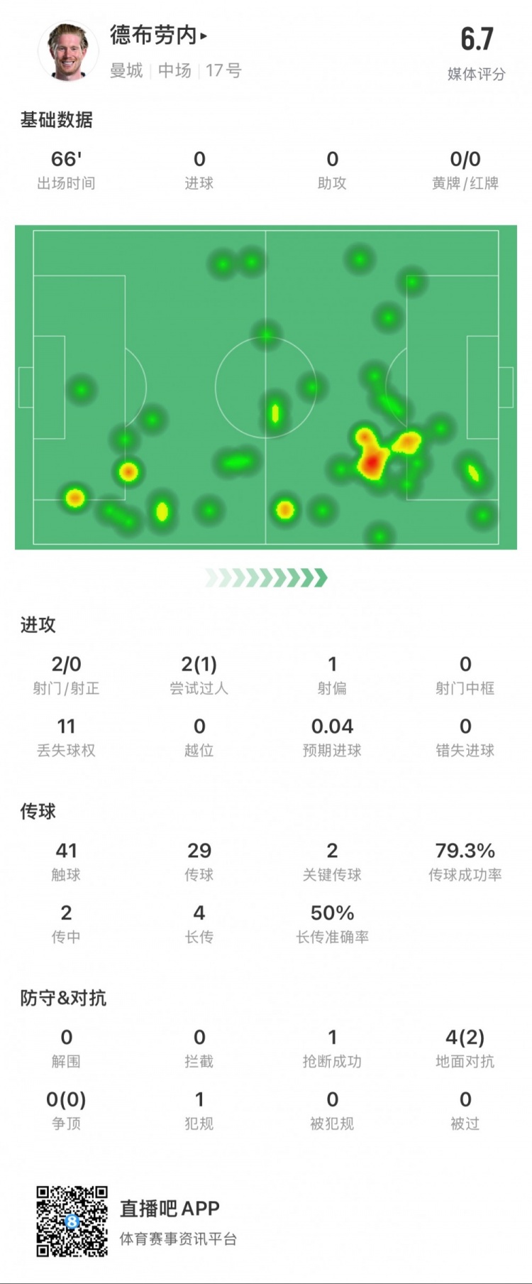 2月24日訊 本輪英超比賽,曼城對陣利物浦,德布勞內(nèi)本場數(shù)據(jù):