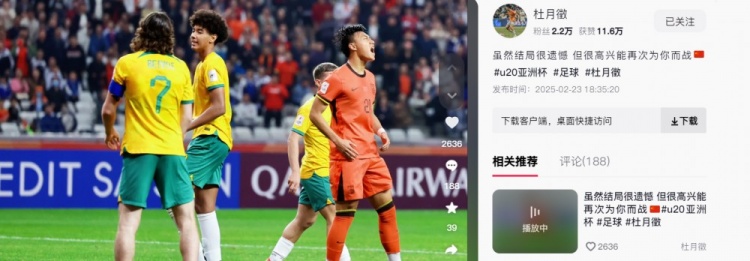 2月24日訊 U20亞洲杯1/4決賽,U20國足0-1遭沙特國青絕殺,無緣世青賽。賽后,U20國足球員杜月徵更新了個人社交媒體。