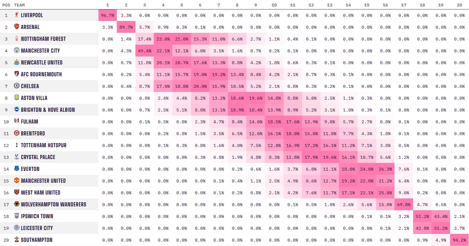 目前利物浦先賽已經(jīng)領(lǐng)先阿森納11分。數(shù)據(jù)機(jī)構(gòu)Opta的超級計(jì)算機(jī)演算顯示,利物浦的奪冠概率已經(jīng)來到了前所未有的96.7%,相比本輪之前上升了整整10個百分點(diǎn)。