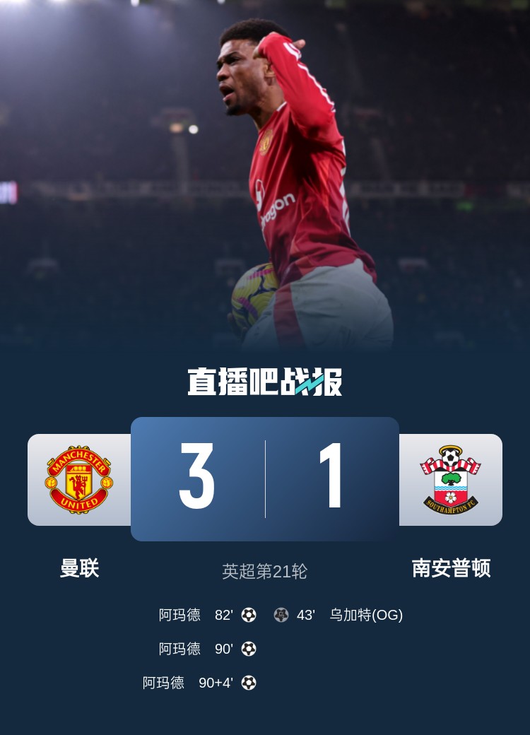 英超第21輪,南安普頓一直到81分鐘還保持1-0領(lǐng)先,隨后阿瑪?shù)逻B進三球逆轉(zhuǎn)比賽。
