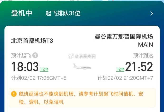 根據(jù)博主“埃萊夫賽”查詢的信息顯示,國安隊(duì)預(yù)計(jì)在今天17:05起飛的飛機(jī)已經(jīng)延時(shí)到18:03,抵達(dá)曼谷的時(shí)間也由21:20變更為21:52。