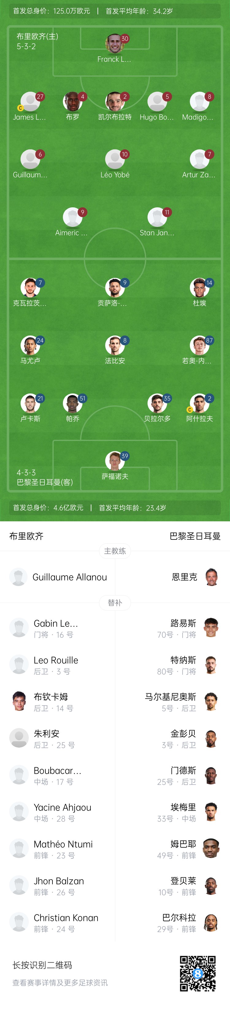 02月26日訊 法國杯1/4決賽,布里歐齊主場vs巴黎圣日耳曼即將打響。賽前首發(fā)出爐。