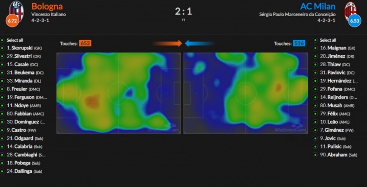 輸給博洛尼亞,米蘭的熱區(qū)表現(xiàn):中場根本沒有任何的控制力