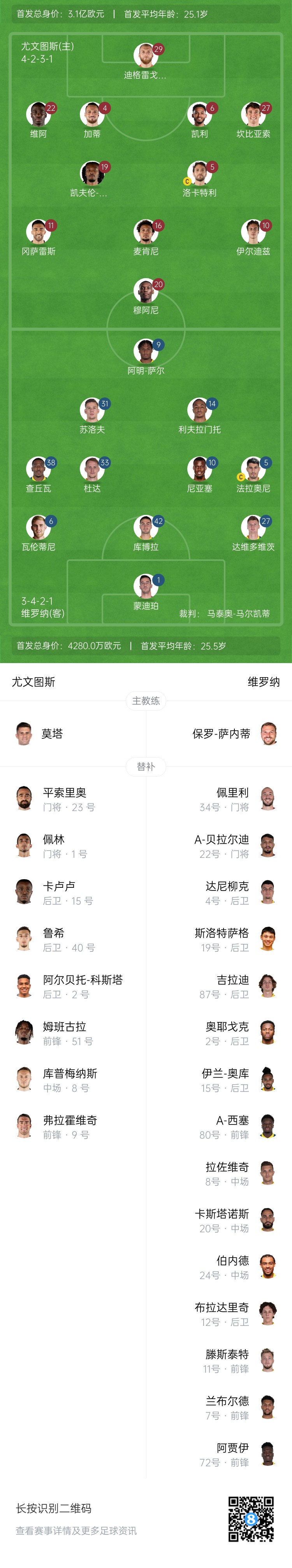 尤文首發(fā):29-迪格雷戈里奧、22-維阿、4-加蒂、6-凱利、27-坎比亞索、5-洛卡特利、19-凱夫倫-圖拉姆、10-伊爾迪茲、16-麥肯尼、11-尼古拉斯-岡薩雷斯、20-穆阿尼