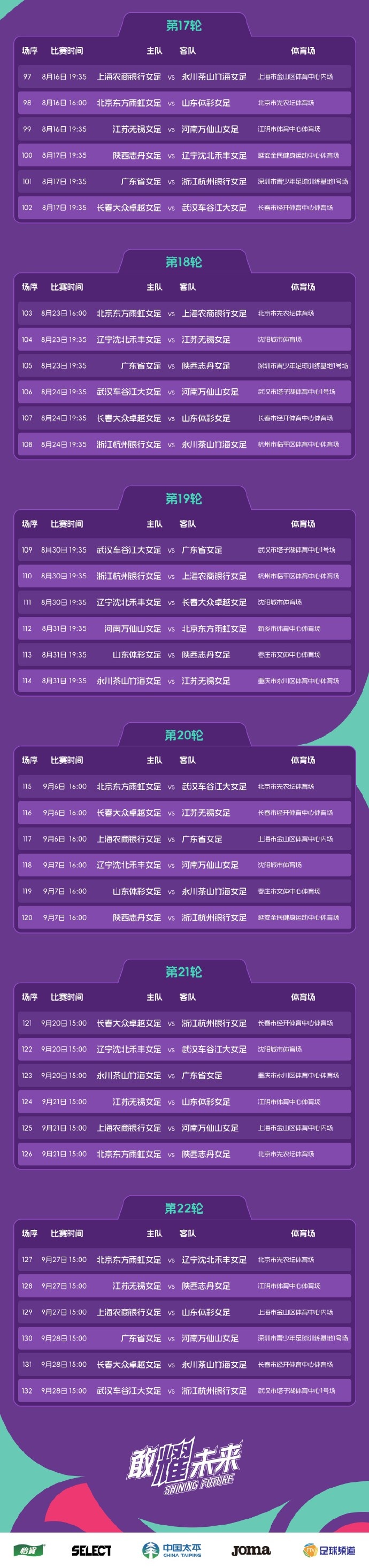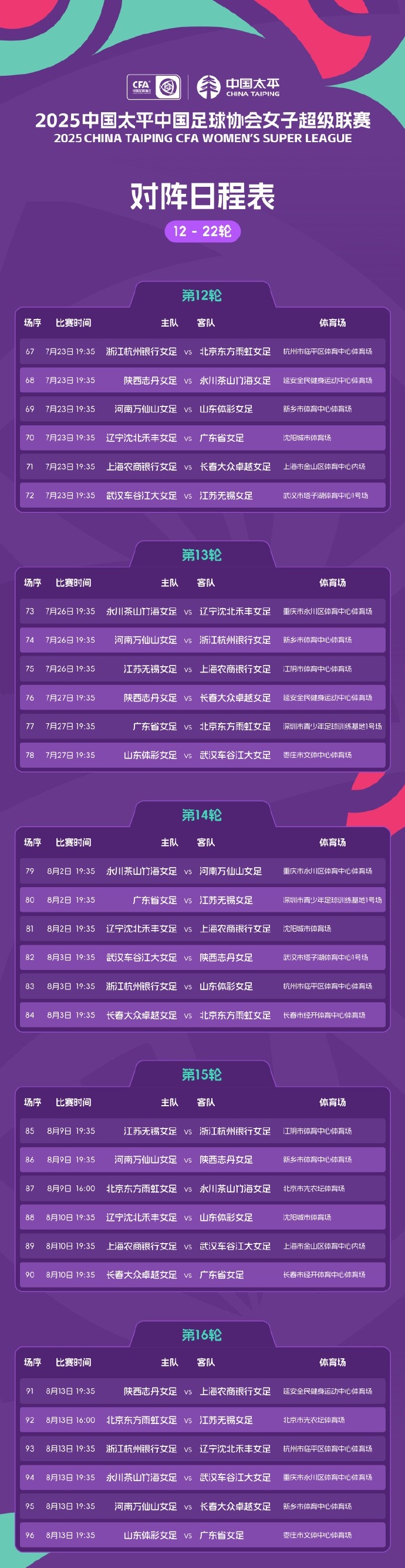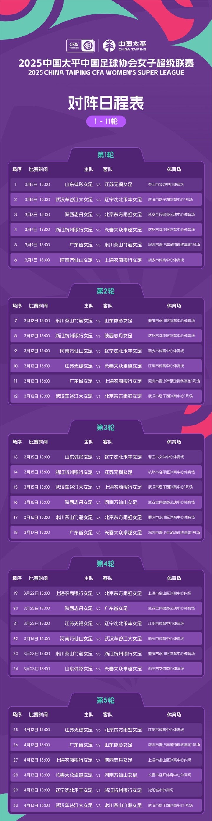 2025中國(guó)太平中國(guó)足球協(xié)會(huì)女子超級(jí)聯(lián)賽對(duì)陣日程表來(lái)了,新賽季3月8日重新登場(chǎng),敢耀未來(lái)! 標(biāo)簽: 足球 中超 中國(guó)足球 轉(zhuǎn)載