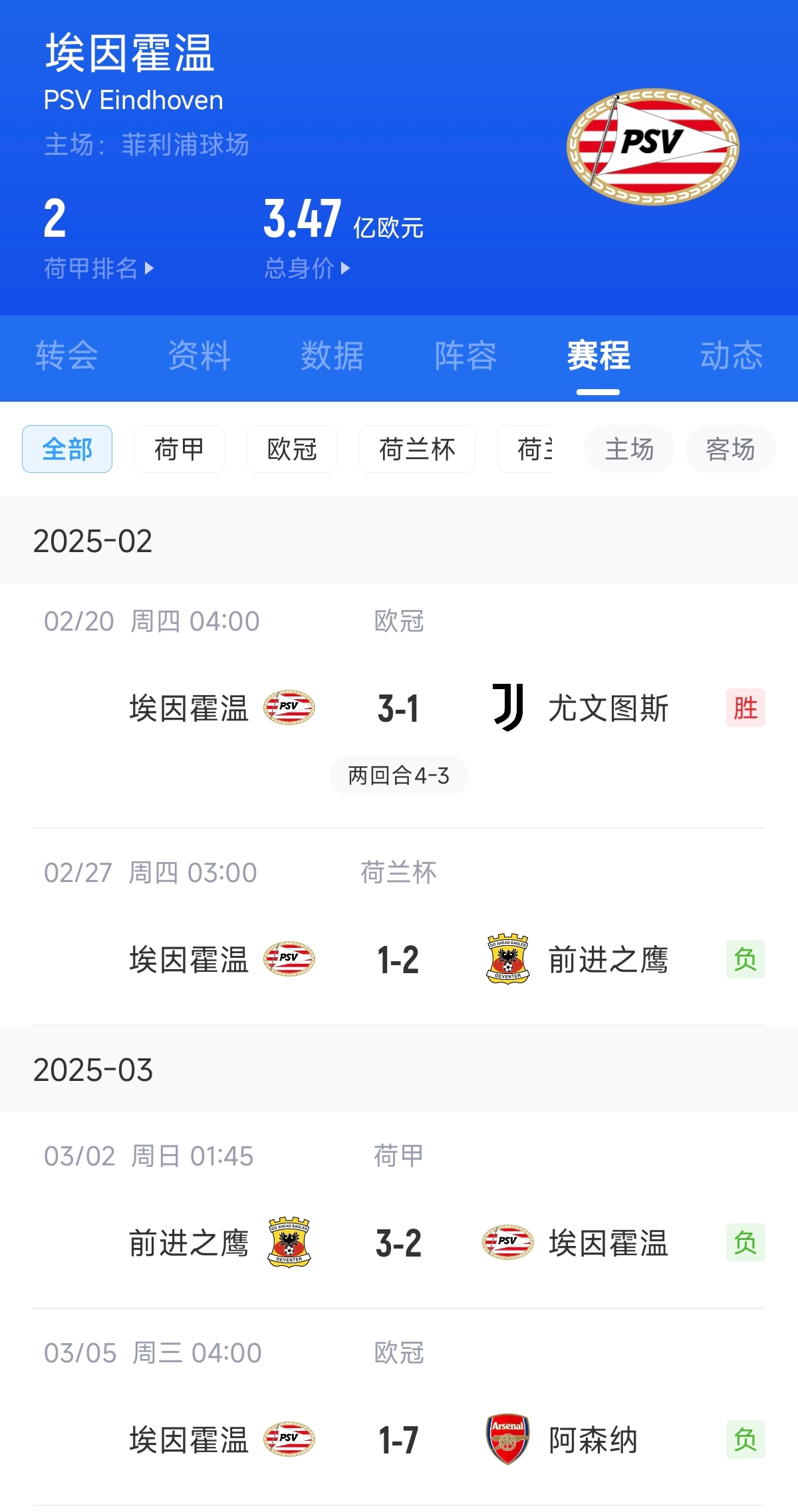 2月27日,埃因霍溫荷蘭杯半決賽1-2不敵前進(jìn)之鷹,無(wú)緣決賽。3月2日荷甲聯(lián)賽,埃因霍溫2-3被前進(jìn)之鷹雙殺,荷甲再丟3分,距離榜首阿賈克斯已有8分差距。3月5日凌晨,埃因霍溫歐冠遭遇慘敗1-7不敵阿森納。